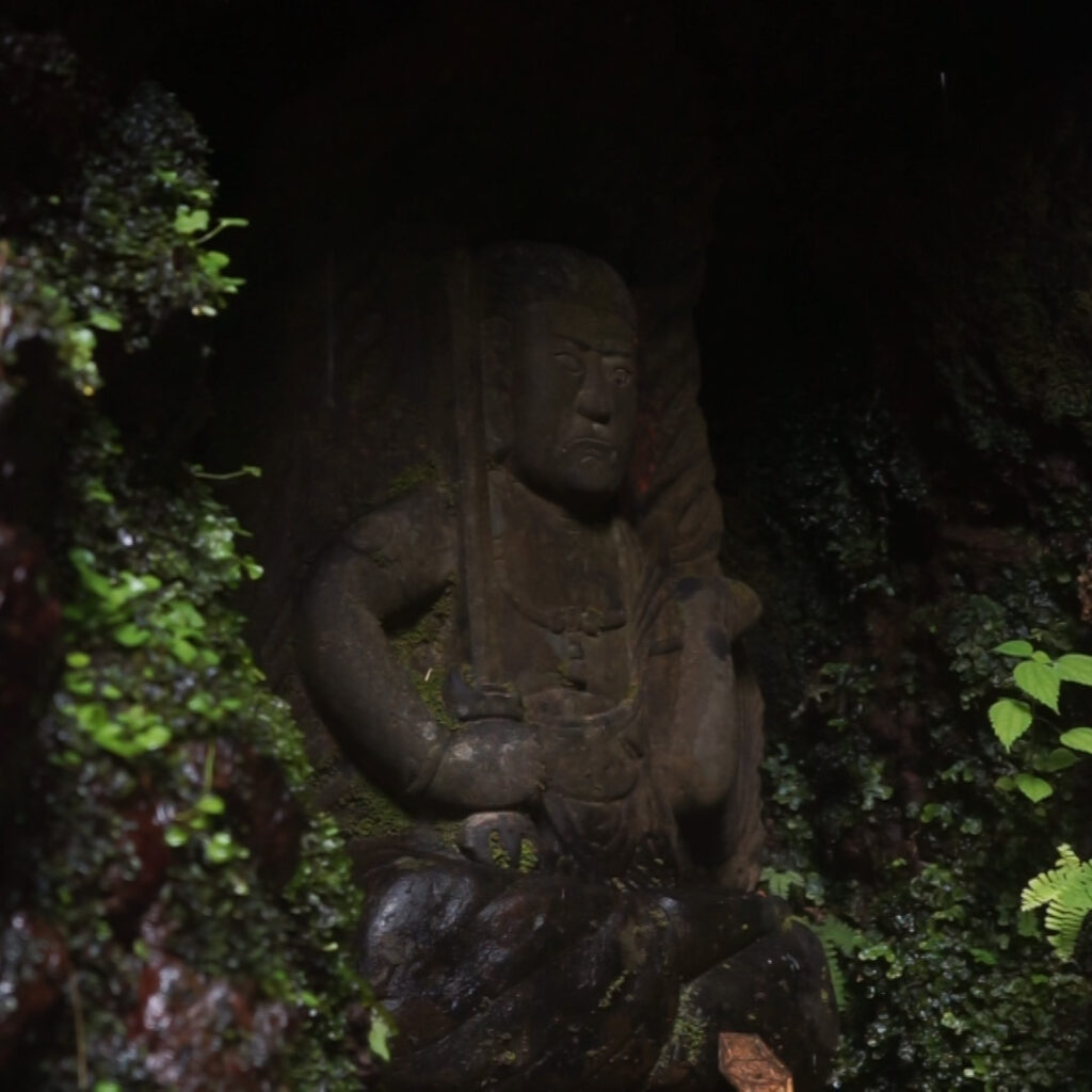 石像は、滝壺のすぐ隣の岩窟に安置されており、皆さまはお不動さまに見守られながら滝行を行います。